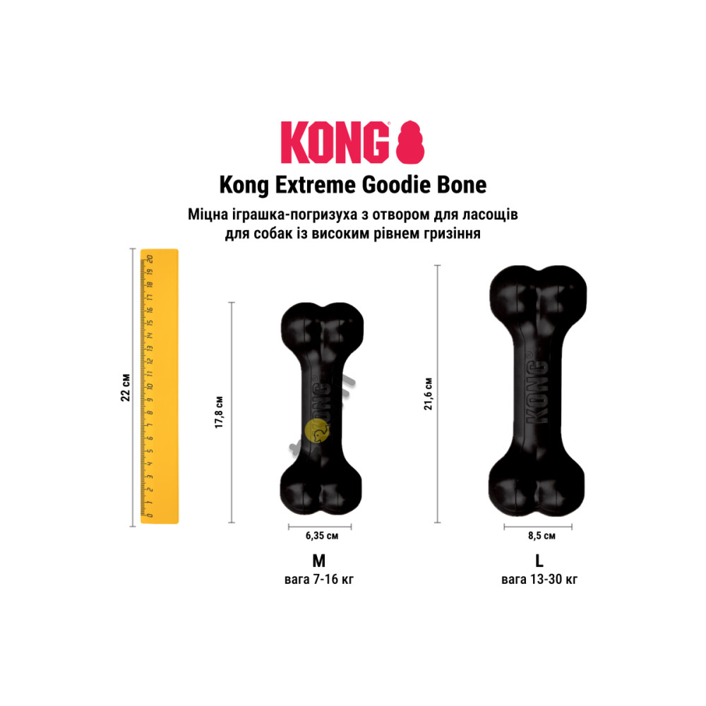 Іграшка-кістка Kong Extreme Goodie Bone чорна — це надміцний аксесуар для собак, що поєднує функції жувальної іграшки та диспенсера для ласощів. Створена з унікального натурального каучуку, вона витримує навіть найінтенсивніше жування та ідеально підходить для собак з потужною щелепою.