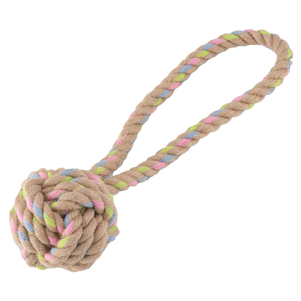 Іграшка-канат з м'ячем на петлі — це універсальний тренувальний снаряд, розроблений для активних ігор на свіжому повітрі та вдома. Виріб поєднує в собі пружний м'яч з натуральної гуми та міцний плетений канат, що дозволяє використовувати його як для дальніх кидків, так і для ігор у перетягування. Ця модель ідеально підходить для собак, які люблять гризти та носити предмети в зубах, забезпечуючи їм необхідне фізичне навантаження.