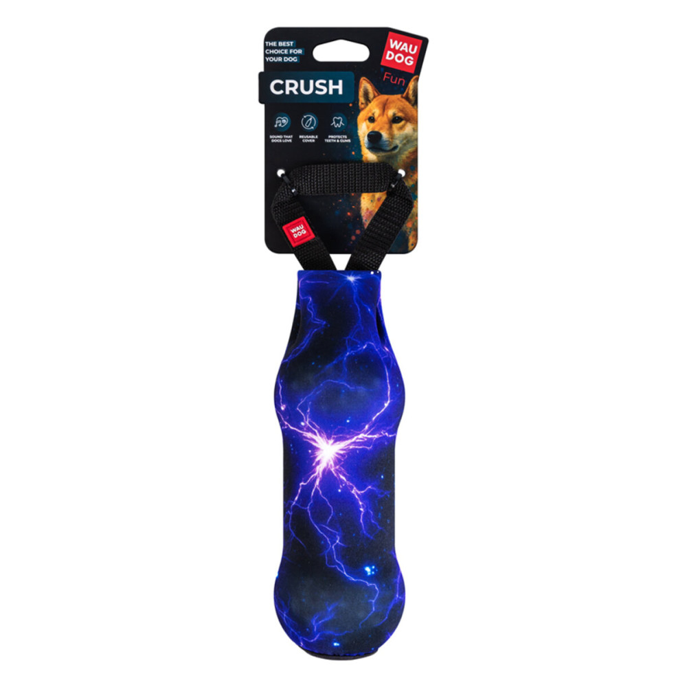 Унікальність іграшки WAUDOG Fun Crush полягає у поєднанні двох типів звуків. Основою є пластикова пляшка, яка при стисканні створює характерний хрускіт, що пробуджує мисливські інстинкти собаки. Додатково на шийку пляшки накручується спеціальна кришка з вбудованою пискавкою, додаючи дзвінкий звук при натисканні.