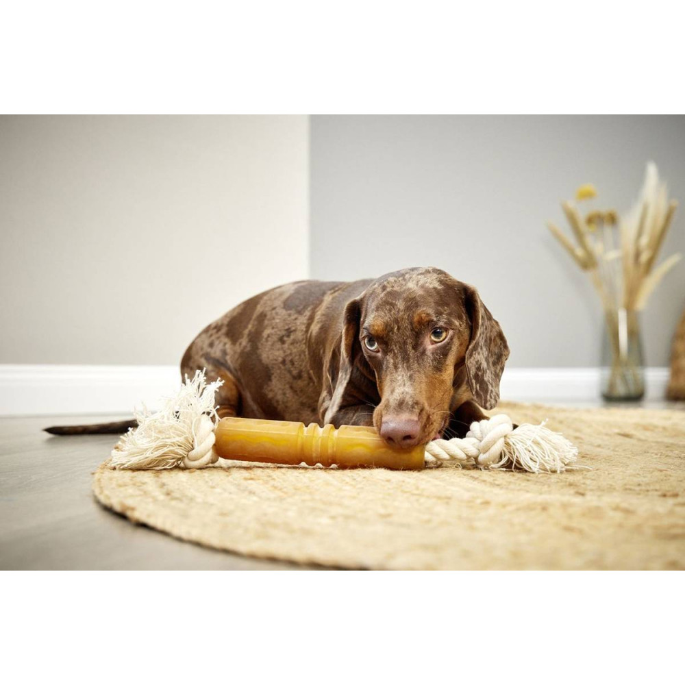 Так, завдяки використанню натурального каучуку, який є достатньо м'яким та еластичним, ця іграшка підходить для цуценят у період зміни зубів, не пошкоджуючи молочні зуби та ясна.