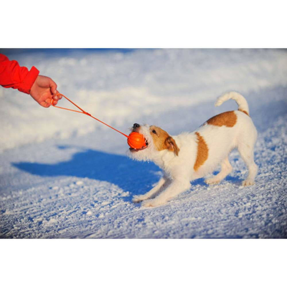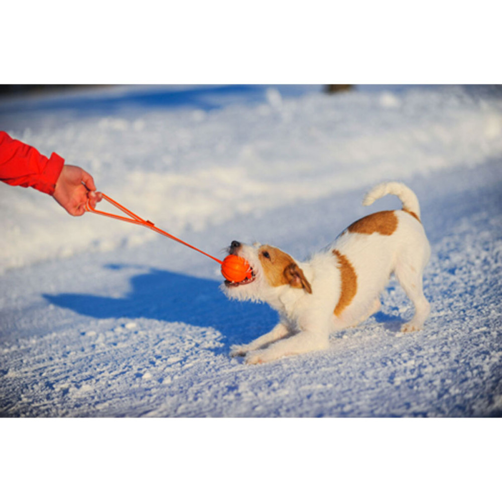 Головною особливістю снаряда є поєднання інноваційного матеріалу самого м'яча та зручної ручки. Композитний полімер поєднує кращі властивості гуми, пластику та нейлону: він легкий, пружний, але не токсичний і не травмує пащу при укусі. Нековзна стрічка створює безпечну дистанцію між долонею господаря та зубами собаки, що робить гру в перетягування максимально комфортною та контрольованою.