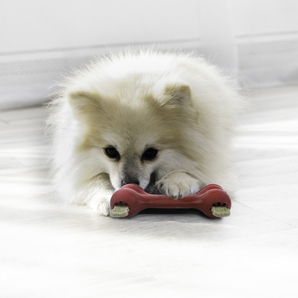- Гігієна ротової порожнини: Рельєфна поверхня та пази для ласощів сприяють механічному очищенню зубів під час жування, допомагаючи зменшити ризик утворення зубного каменю та покращити свіжість подиху.