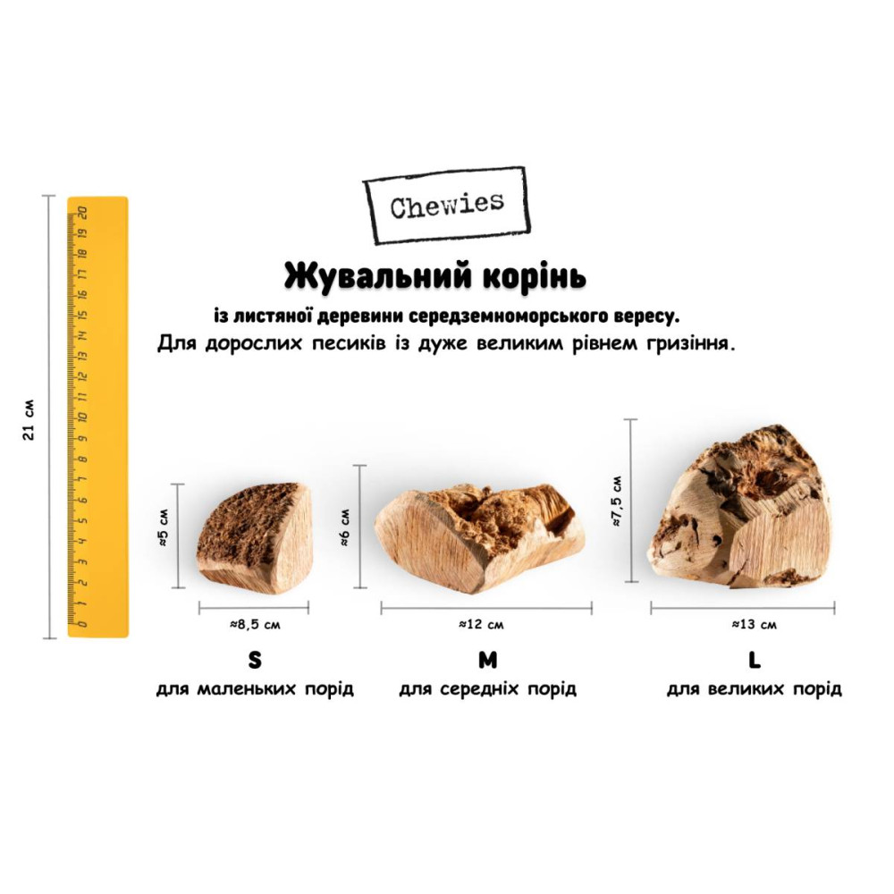 Жувальний корінь Chewies — це повністю натуральна, екологічно чиста іграшка для собак, виготовлена з деревини вересу. Цей виріб спеціально розроблений для задоволення природного жувального інстинкту та витримує екстремальні навантаження щелеп. На відміну від звичайних палиць, корінь не утворює небезпечних скалок і забезпечує тривалу зайнятість вашого улюбленця.