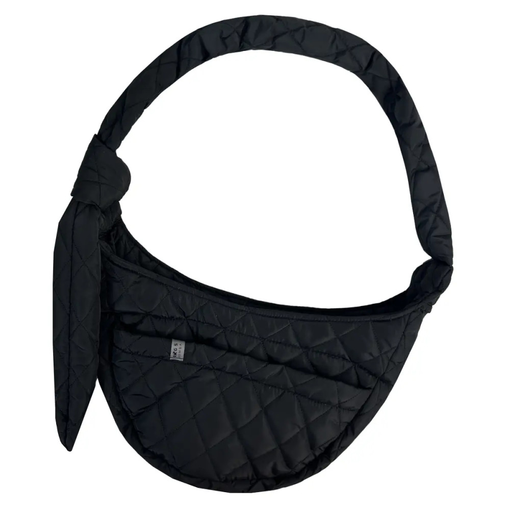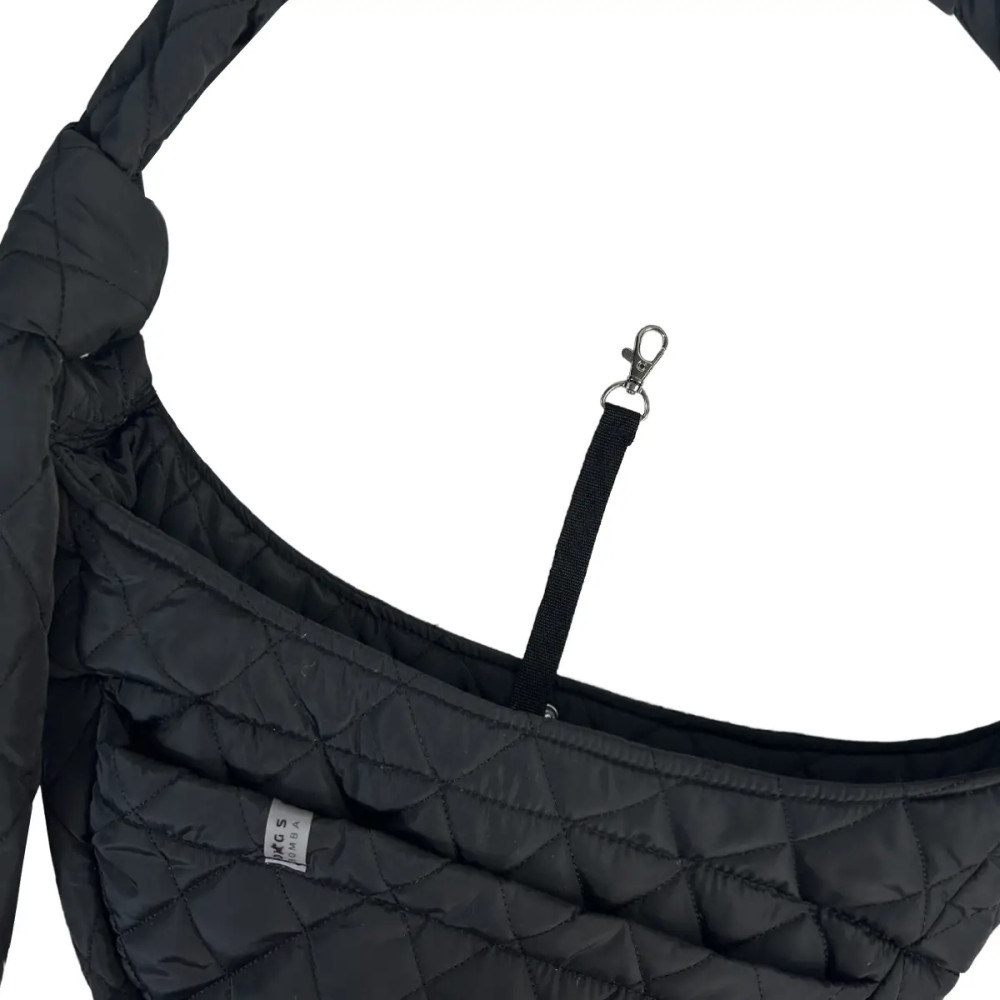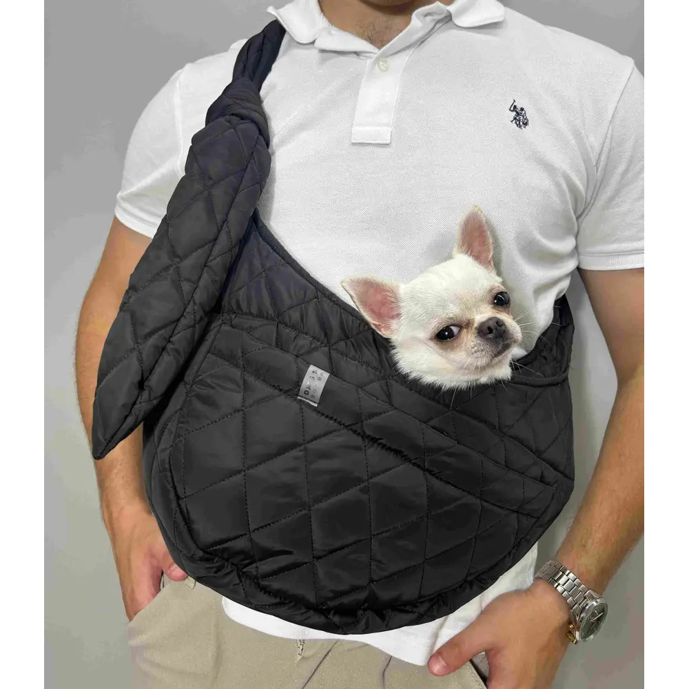 S-89 — стьобаний слінг-переноска для собак у чорному кольорі. Зовнішня водовідштовхувальна плащова тканина захищає від легкої вологи, усередині є спеціальний ремінець для безпечного кріплення до нашийника чи шлейки. Регульована по довжині ручка дозволяє зручно носити через плече, а кишеня на кнопці тримає ключі, пакети або смаколики під рукою.