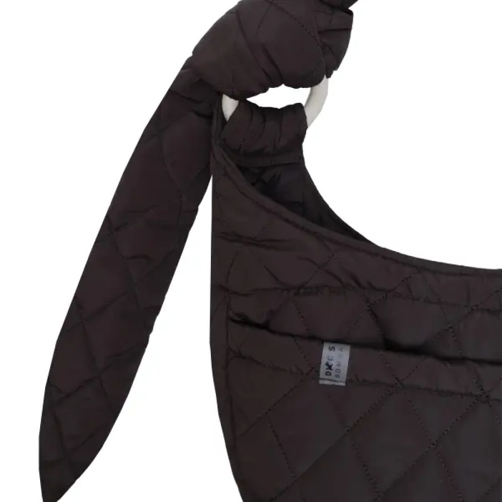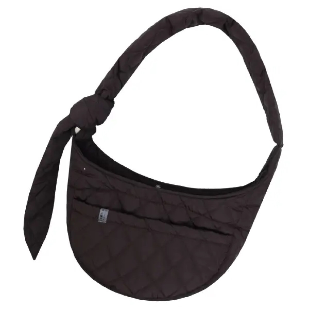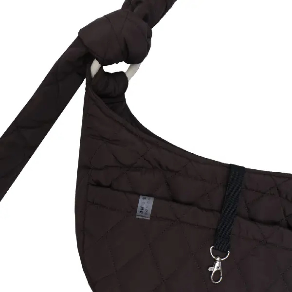 S-90 — стьобаний слінг-переноска для собак у кольорі «шоколад». Зовнішня водовідштовхувальна плащова тканина захищає від вологи, усередині розташований спеціальний ремінець для безпечного кріплення до нашийника або шлейки. Регульована ручка дозволяє підлаштувати посадку під зріст власника, а кишеня на кнопці тримає при собі ключі, ласощі чи пакети.