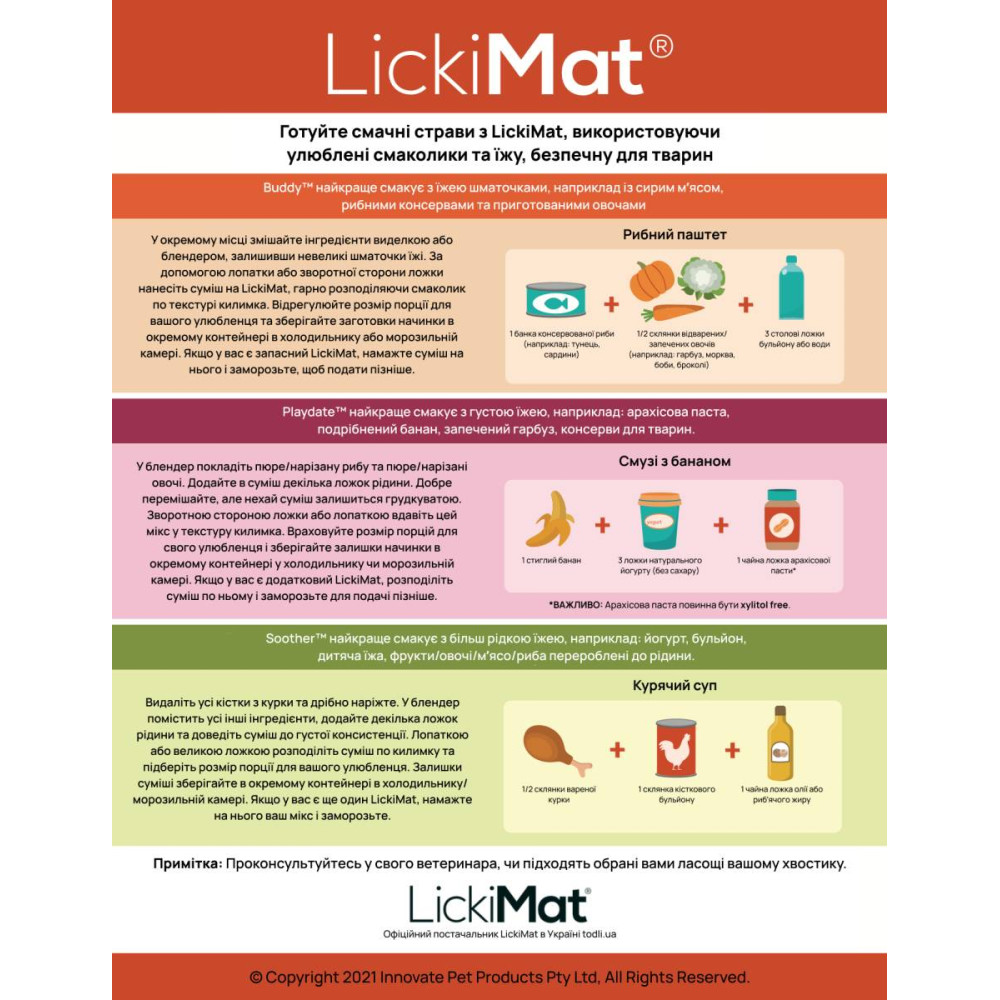 Процес вилизування ласощів з рельєфної поверхні килимка допомагає собаці розслабитися та знизити рівень тривоги. Це чудове рішення, щоб зайняти улюбленця, поки ви зайняті, або під час стресових ситуацій, наприклад, грози чи візиту до ветеринара.Переваги килимка для собак LickiMat: