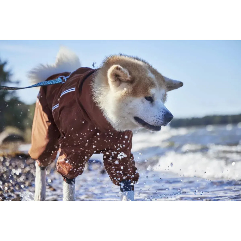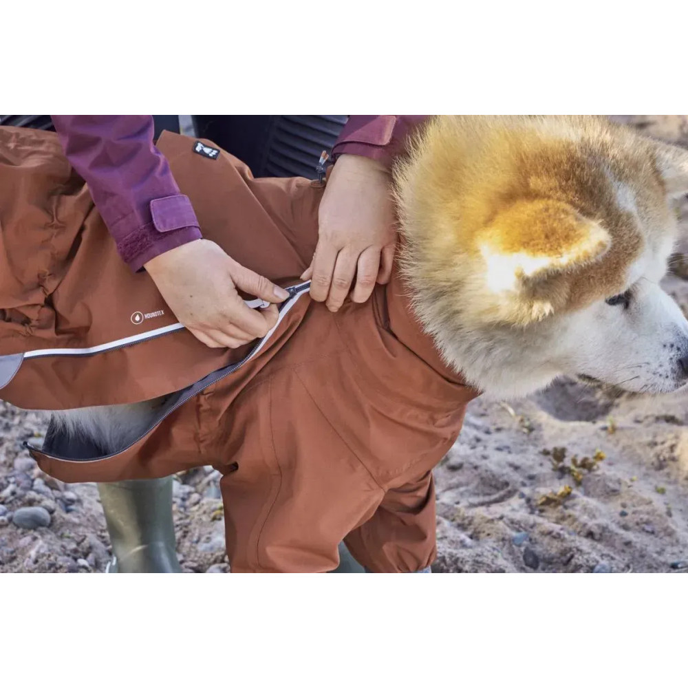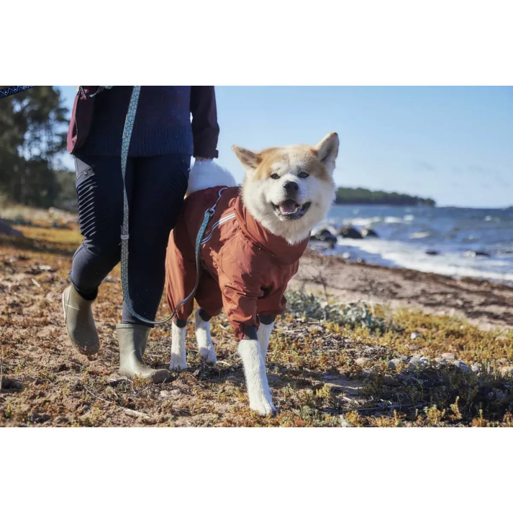 Hurtta Mudventure Overall ECO — помаранчевий дощовик-комбінезон для собак із повним прикриттям корпусу та лап. Легка безпідкладкова конструкція захищає від дощу, бруду й вітру: тканина з мембраною 10 000 мм, повністю проклеєні шви і внутрішній водонепроникний комір Rainstopper, що щільно закриває шию. Широкий вітрозахисний клапан герметизує блискавку, а верхній закривний отвір для шлейки/повідка блокує потрапляння води.