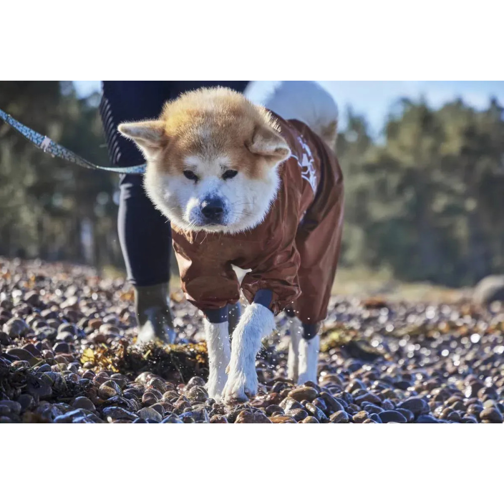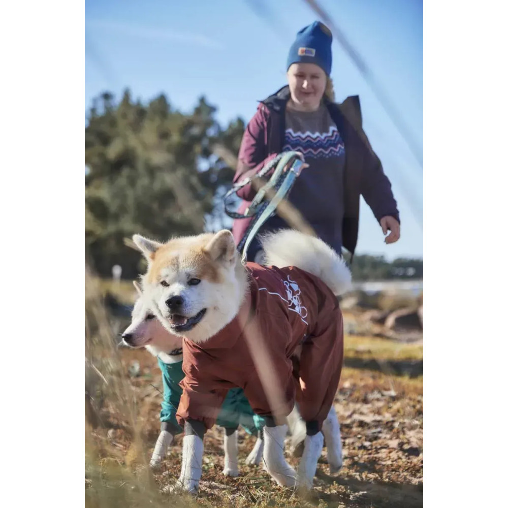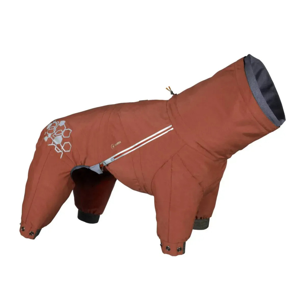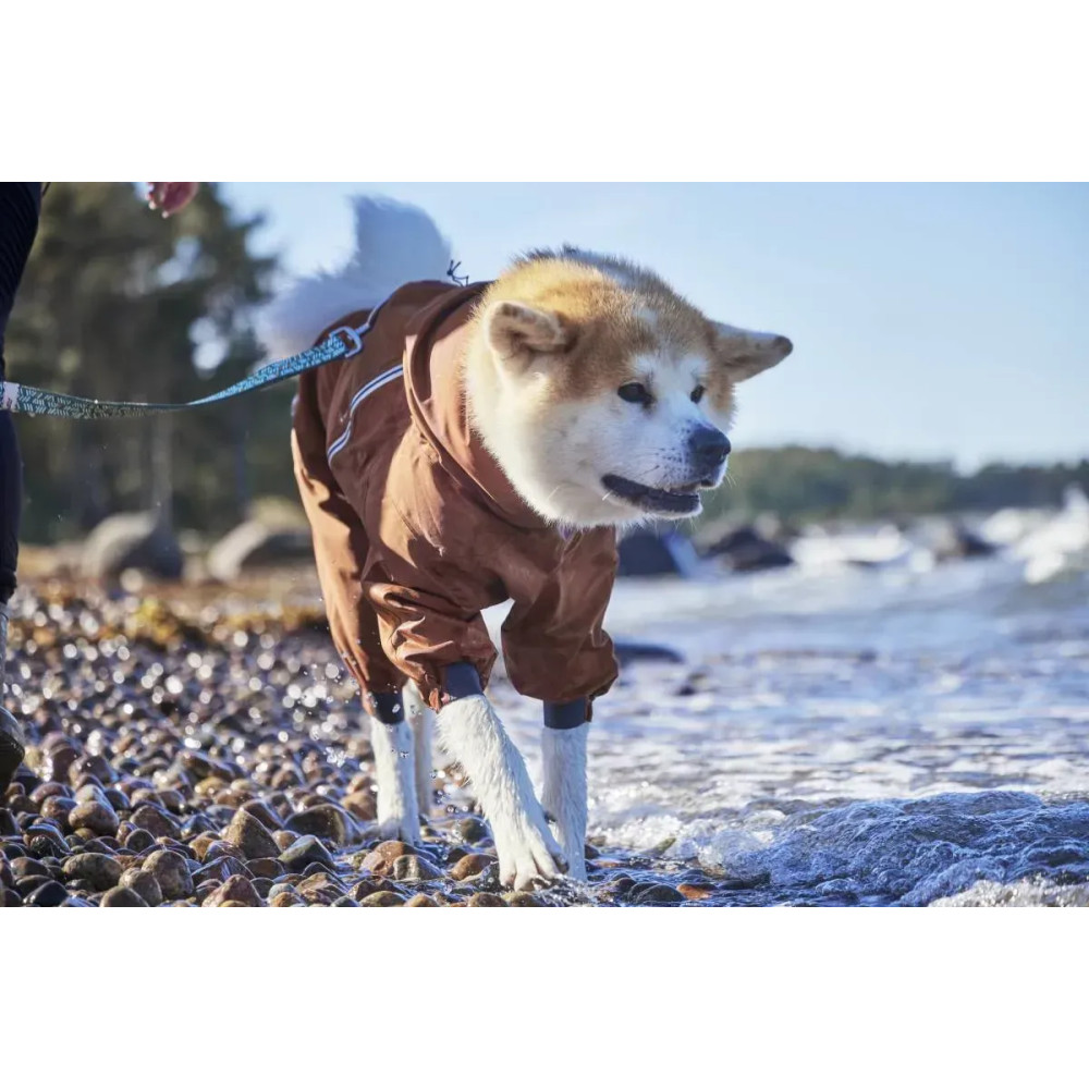 Hurtta Mudventure Overall ECO — помаранчевий дощовик-комбінезон для собак із повним прикриттям корпусу та лап. Легка безпідкладкова конструкція захищає від дощу, бруду й вітру: тканина з мембраною 10 000 мм, повністю проклеєні шви і внутрішній водонепроникний комір Rainstopper, що щільно закриває шию. Широкий вітрозахисний клапан герметизує блискавку, а верхній закривний отвір для шлейки/повідка блокує потрапляння води.