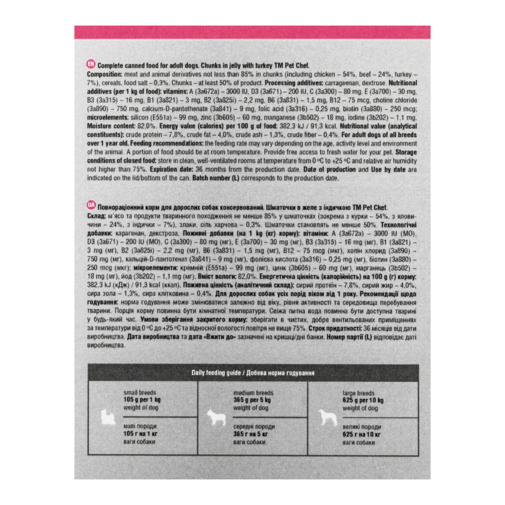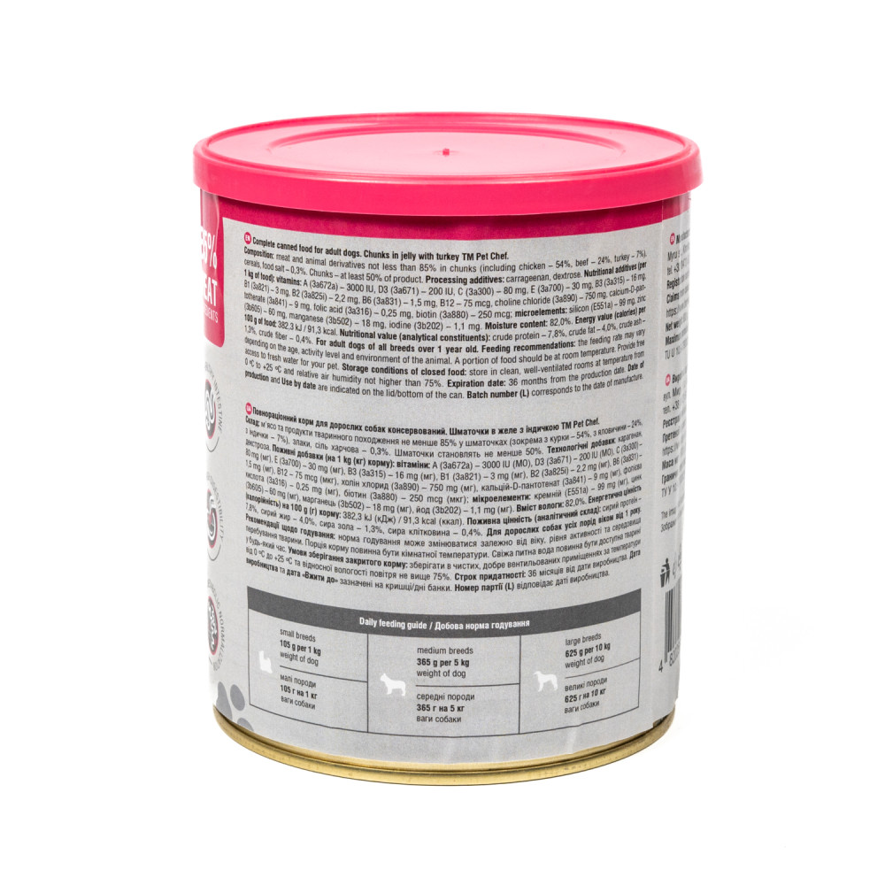 Pet Chef з індичкою — повнораціонний вологий корм для дорослих собак усіх порід від 1 року. М’ясні шматочки в желе містять не менше 85% м’ясних інгредієнтів у шматочках: курка (54%), яловичина (24%), індичка (7%). Шматочки становлять не менше 50% вмісту банки. Корм збагачений холіном для здоров’я мозку, печінки та нервової системи. Без барвників, рослинних білків і жирів, м’ясо-кісткового борошна. Банка має пластикову кришку для збереження свіжості. Виробництво — Україна.