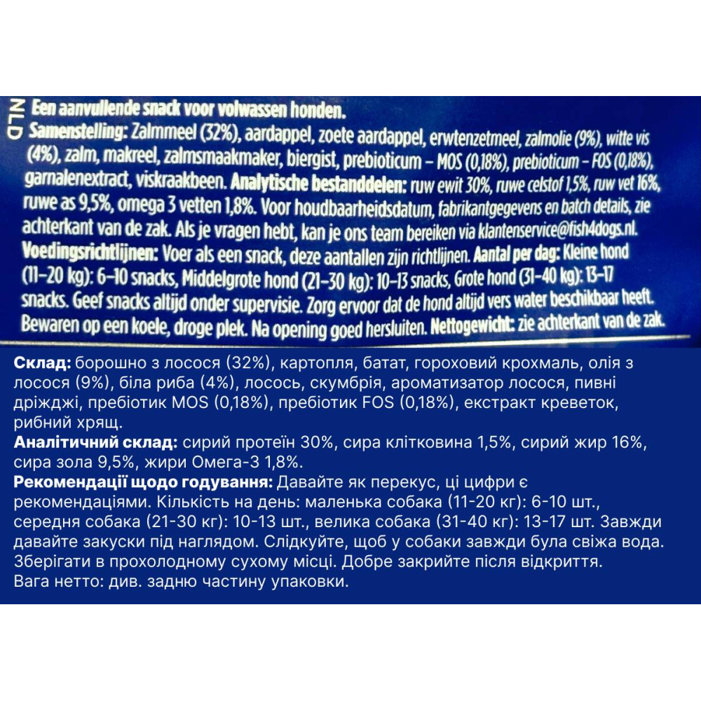 | Склад | Лососеве борошно (32%), картопля, батат, гороховий крохмаль, лососева олія (9%), біла риба (4%), лосось, скумбрія, лососевий дайджест, пивні дріжджі, пребіотик MOS (0,18%), пребіотик FOS (0,18%), екстракт креветок, рибний хрящ |