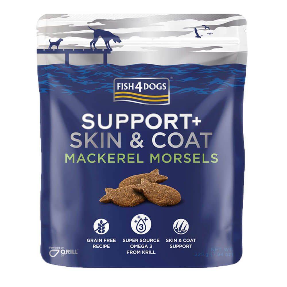 Fish4Dogs Support+ Skin & Coat — функціональне печиво зі скумбрією та крилем, створене для підтримки здоров'я шкіри та блиску шерсті. Ключовий інгредієнт — криль (5%), який містить омега-3 жирні кислоти у формі фосфоліпідів. Ця форма засвоюється організмом собаки значно ефективніше, ніж звичайна рибна олія. Загальний вміст омега-3 у формулі — 2,4%, найвищий у лінійці Support+.