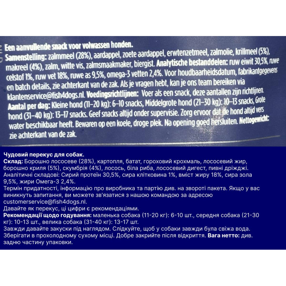 Fish4Dogs — британський бренд із понад 20-річним досвідом виробництва рибних кормів для собак. Основу рецептури складає лососеве борошно (28%) та скумбрія (4%) — виключно рибний білок, без м'яса птиці чи яловичини. Це робить печиво гіпоалергенним варіантом для собак з харчовою чутливістю, яка часто проявляється саме через шкіру та шерсть.