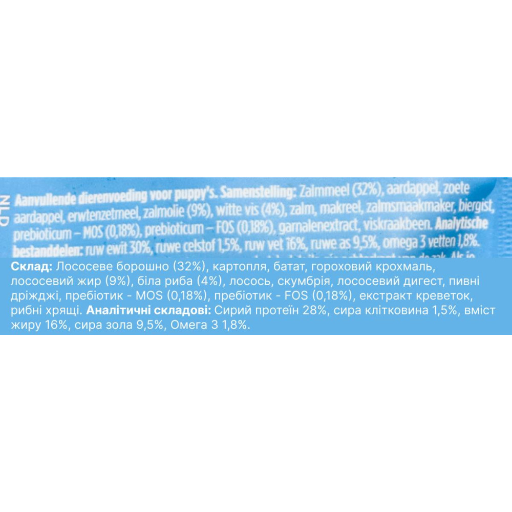 | Склад | Лососеве борошно (32%), картопля, батат, гороховий крохмаль, лососева олія (9%), біла риба (4%), лосось, скумбрія, лососевий дайджест, пивні дріжджі, пребіотик MOS (0,18%), пребіотик FOS (0,18%), екстракт креветок, рибний хрящ |
