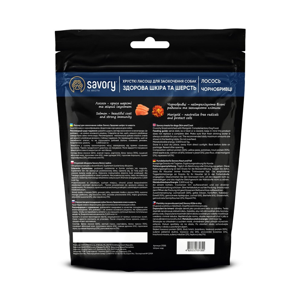 Savory (Україна) виробляє ласощі з натуральних інгредієнтів. Ексклюзивна рецептура з м’ясом першої категорії без сої та ГМО. Без зерна, цукру, штучних консервантів та барвників — тільки корисне для вашої собаки.