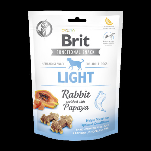 Brit Functional Snack Light – це функціональні ласощі, які допомагають підтримувати оптимальну вагу тіла у собак. Чим вони відрізняються від звичайних смоколиків, адже улюбленці з таким задоволенням ними ласують? Дійсно, рецептура Brit Functional Snack Light складена таким чином, щоб песик отримував насолоду від кожного шматочку ласощів. Але, крім смаку, ці снеки ще й надзвичайно корисні. Погляньмо на складники: • М'ясо кролика – дієтичне джерело білка, відмінно підходить для тварин, які потребують контролю ваги • Папая, псиліум і бамбукова лігноцелюлоза стабілізують процеси травлення та сприяють схудненню • Фульвові кислоти виводять токсини з організму, покращують засвоєнню поживних речовин, стабілізують мікрофлору кишківника • Екстракт дині Канталупа – антиоксиданти для нейтралізації негативної дії вільних радикалів