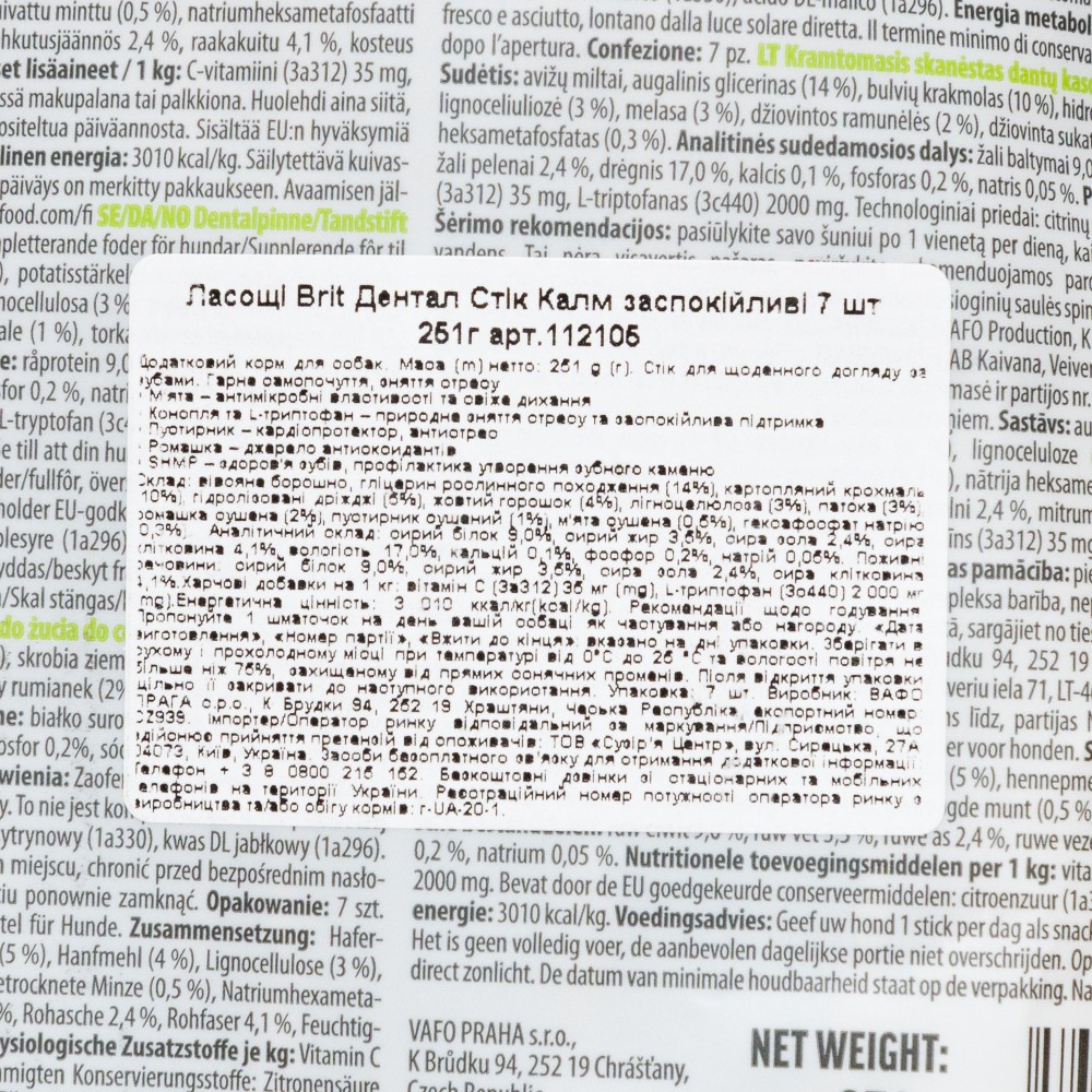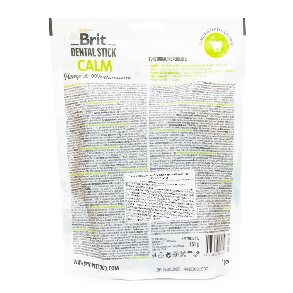 Снеки з коноплями та пустирником для щоденного догляду за зубами собак. Піклуються про гарне самопочуття та знімають стрес в улюбленців. Brit Dental Stick спеціально створені для догляду за зубами песиків, ці функціональні ласощі ідеально підходять для щоденного споживання. Їхня структура розроблена для механічного очищення зубів, а гексаметафосфат натрію (SHMP) виконує функцію зубної пасти. • М'ята – антимікробні властивості та свіже дихання • Конопля та L-триптофан – природне зняття стресу та заспокійлива підтримка • Пустирник – кардіопротектор, антистрес • Ромашка – джерело антиоксидантів • SHMP – здоров'я зубів, профілактика утворення зубного каменю