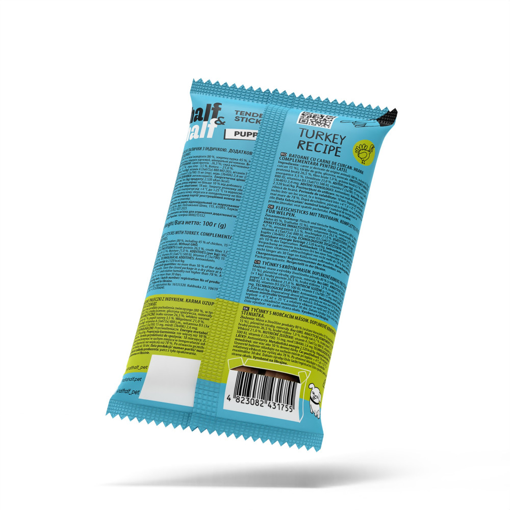 Half&Half м'ясні палички з індичкою — натуральні ласощі, розроблені спеціально для цуценят. М'ясний вміст — 80% (курка 45%, індичка 15%). Індичка — гіпоалергенне дієтичне м'ясо, безпечне для чутливого травлення молодих собак. Пшеничні висівки додають клітковину для формування здорової мікрофлори кишківника. Ідеальні для привчання цуценяти до команд та соціалізації.