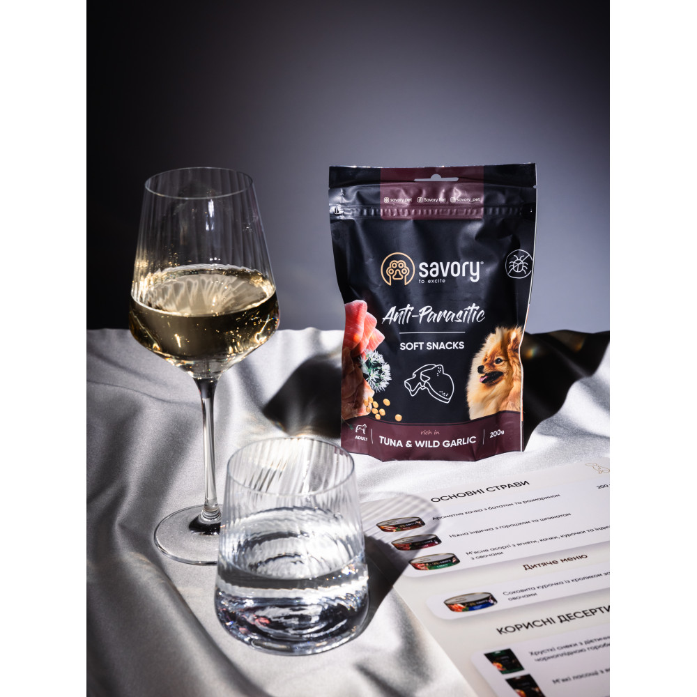 М'які ласощі Savory для дорослих собак усіх порід. Додаткове харчування, яке можна використовувати у якості заохочення та, як винагороду для улюбленця. Не тільки висока смакова привабливість, але й корисні складові, що є основою здорового харчування, роблять ласощі Savory ідеальним доповненням до основного раціону і частуванням для вашого улюбленця. Тунець – дієтичне джерело гіпоалергенного протеїну, завдяки якому снеки можна використовувати для чутливих порід улюбленців, що схильні до алергій та проблем слізних плям. Дикий часник має чудовий антипаразитарний ефект, але за умови регулярного вживання. Ascophyllum nodosum - норвежські бурі водорості, які забезпечать організм улюбленця пребіотиками та клітковиною для здорового травлення.