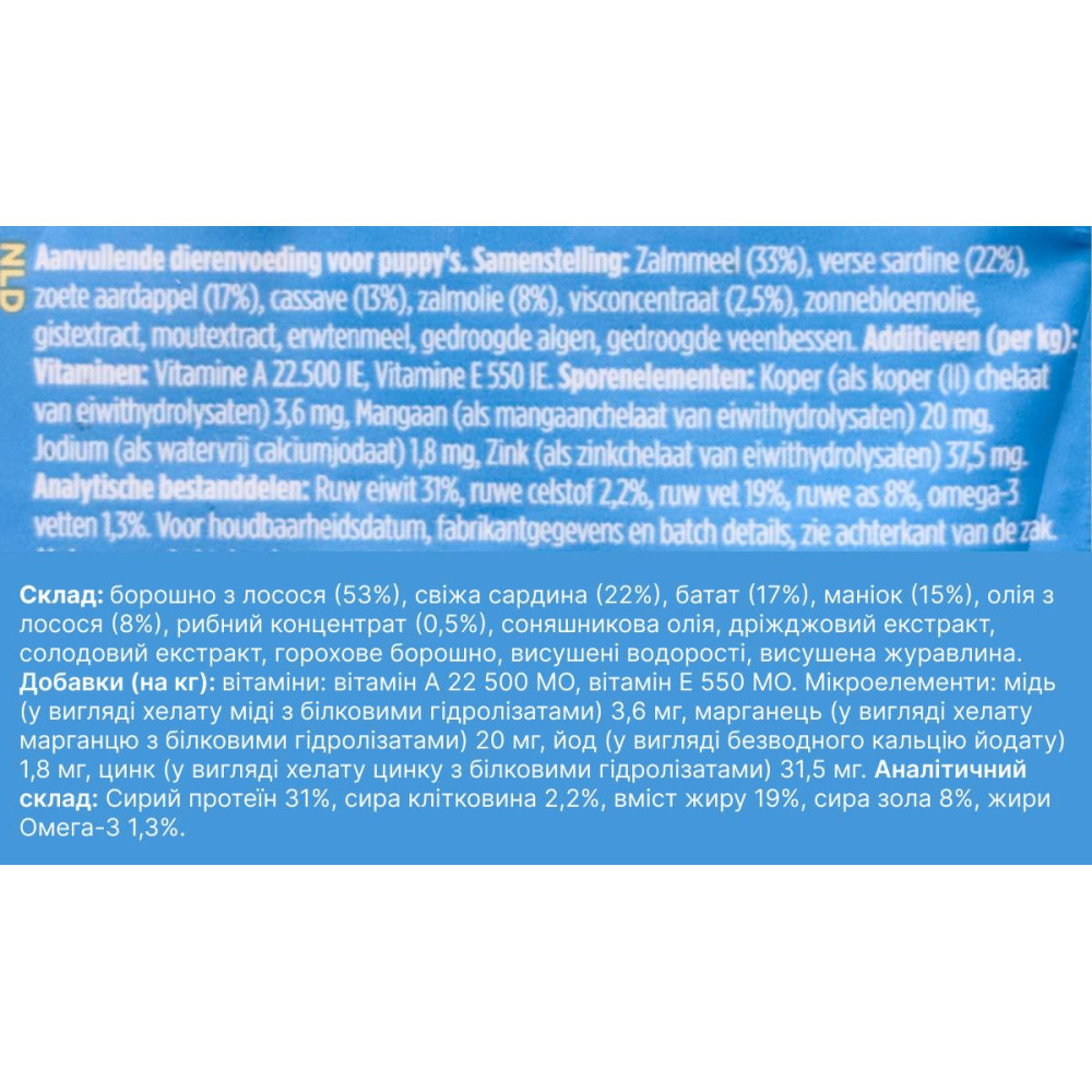Печиво — хрустке та тверде, допомагає при зміні зубів. Шматочки лосося — м'які, підходять для найменших цуценят. Обидва містять рибний білок та омега-3.