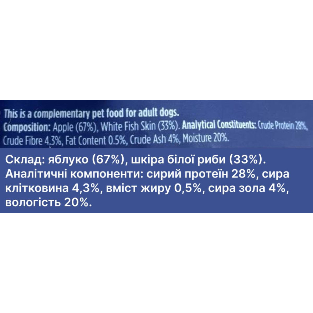 | Склад | Яблуко (67%), шкіра білої риби (33%) |
