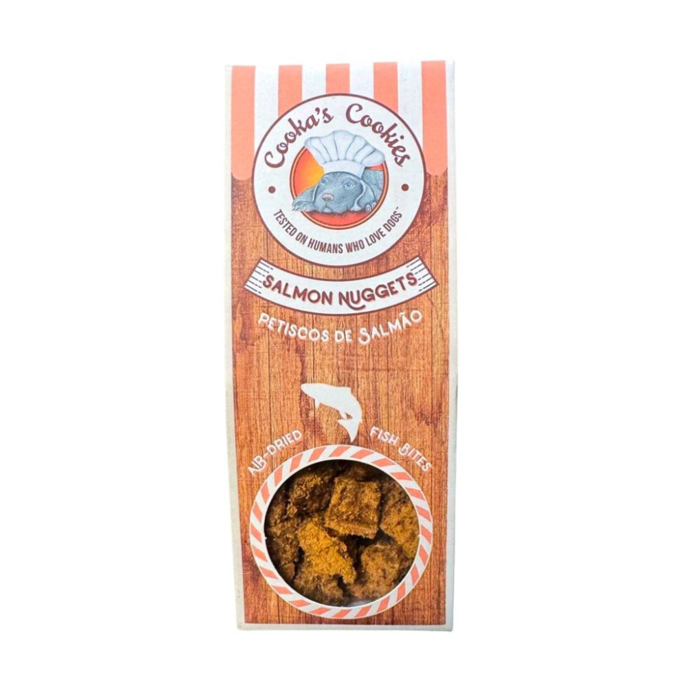 Cooka's Cookies Salmon Nuggets — натуральні сушені ласощі з Португалії зі 100% лосося та тріски. Виготовлені зі свіжого лосося та тріски. Ніжно дегідратовані для збереження поживних речовин.