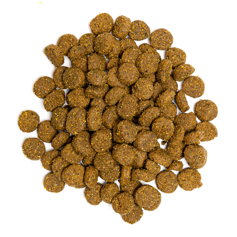 курка 40% (дегідратована курка 20%, борошно з м’яса курки 20%), кукурудза, картопля (20%), курячий жир (консервований сумішшю токоферолів, джерело вітаміну E) (8%), сушені яблука, пивні дріжджі, гідролізована куряча печінка (2%), борошно з креветок (1,5%), лососева олія (1%), морські водорості (0,5%), сульфат глюкозаміну (0,02%), корінь цикорію (джерело маннанолігосахаридів 0,018%), трав’яна суміш (фенхель, базилік, шавлія 0,018%), фруктоолігосахариди (0,012%), сульфат хондроїтину (0,012%) екстракт юки (Yucca schidigera) (0,01%). Аналітичні компоненти: сирий протеїн 26, 0%, cирий жир 16, 0%, сира клітковина 2, 8%, волога 10, 0%, сира зола 7, 2%, кальцій 1, 6%, фосфор 1, 2%, Омега-3 0, 25%, Омега-6 1, 90%.