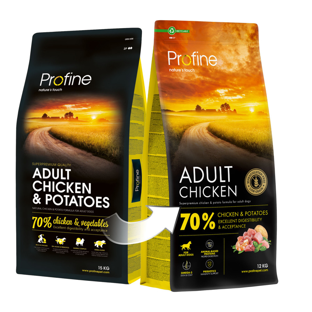 Сухий корм для дорослих собак всіх порід Profine Adult Chicken з куркою – натуральна формула суперпреміум класу. Рецептури лінійки Profine містять природні складники та гарантують збалансоване харчування вашому улюбленцю. Високий вміст курятини сприяє чудовій засвоюваності корму. Унікальне поєднання курятини з картоплею забезпечує здорове травлення, достаток енергії та прекрасну фізичну форму, а додавання морепродуктів (креветок та лососевої олії) гарантує збалансоване співвідношення жирних кислот Омега-3 та Омега-6 для здорової шкіри та гарної шерсті. Екстракти фенхелю, базиліка і шавлії разом з водоростями та пребіотиками покращують травлення і підтримують здорову мікрофлору кишківника, що сприяє міцному імунітету.
