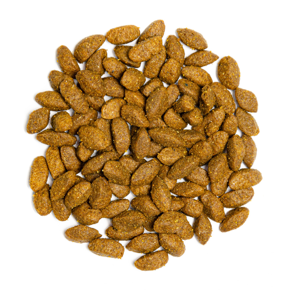 курка 50% (дегідратована курка 25%, борошно з м’яса курки 25%), курячий жир (консервований сумішшю токоферолів, джерело вітаміну E) (13%), кукурудза, картопля (5%), пивні дріжджі, сушені яблука, гідролізована куряча печінка (2%), борошно з креветок (1,5%), лососева олія (1%), морські водорості (0,5%), сульфат глюкозаміну (0,02%), корінь цикорію (джерело маннанолігосахаридів 0,018%), трав’яна суміш (фенхель, базилік, шавлія 0,018%), фруктоолігосахариди (0,012%), екстракт юки (Yucca schidigera) (0,01%), сульфат хондроїтину (0,012%). Аналітичні компоненти: сирий протеїн 33, 0%, cирий жир 22, 0%, сира клітковина 2, 0%, волога 10, 0%, сира зола 7, 2%, кальцій 1, 7%, фосфор 1, 2%, Омега-3 0, 22%, Омега-6 2, 80%.