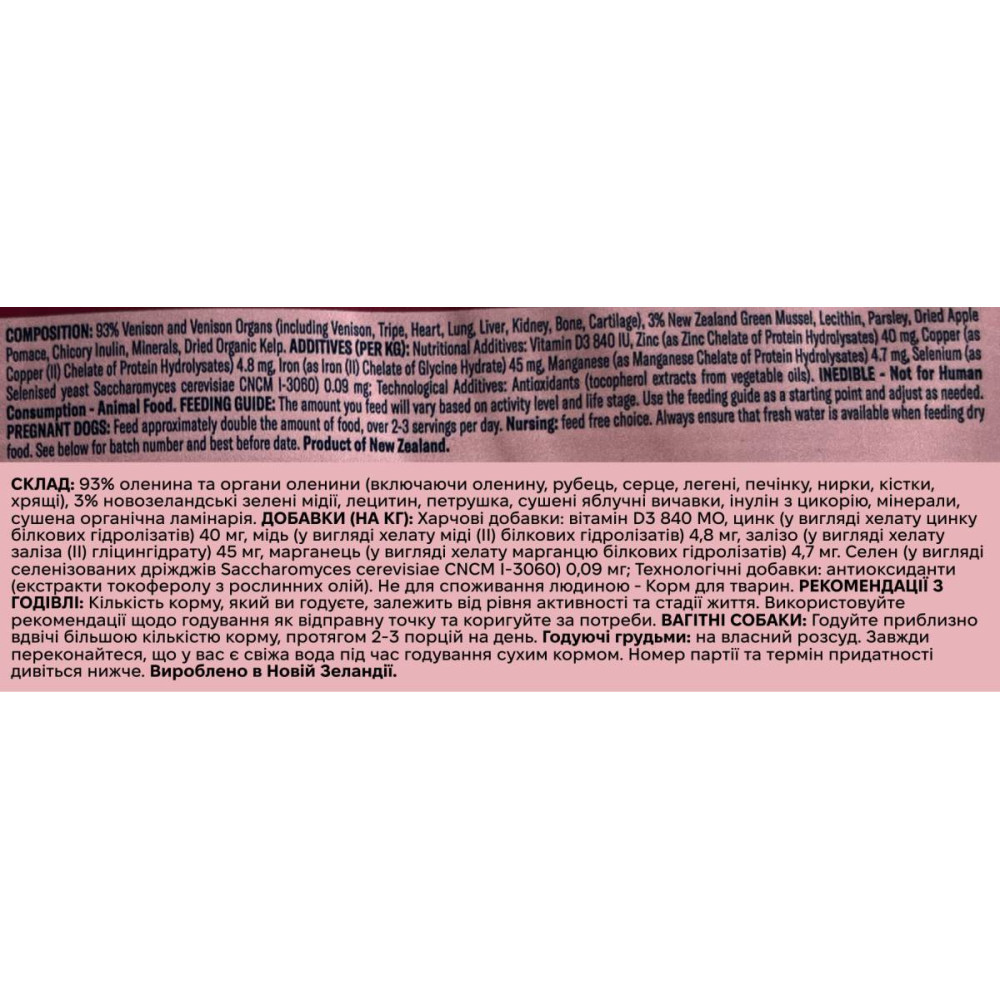 Оленина, олениний рубець, олениний серце, олениний легені, олениний печінка, олениний нирки, новозеландські зелені мідії, олениний кістка, лецитин, петрушка, сушений яблучний жмих, інулін (з кореня цикорію), оленячий хрящ, мінерали (дикалій фосфат, магнію сульфат, цинк амінокислотний комплекс, залізо амінокислотний комплекс, мідь амінокислотний комплекс, марганець амінокислотний комплекс, селенові дріжджі), сушена органічна ламінарія, сіль, консервант (лимонна кислота, змішані токофероли), вітаміни (вітамін E, тіамін мононітрат, рибофлавін, піридоксин гідрохлорид, вітамін D3, фолієва кислота).