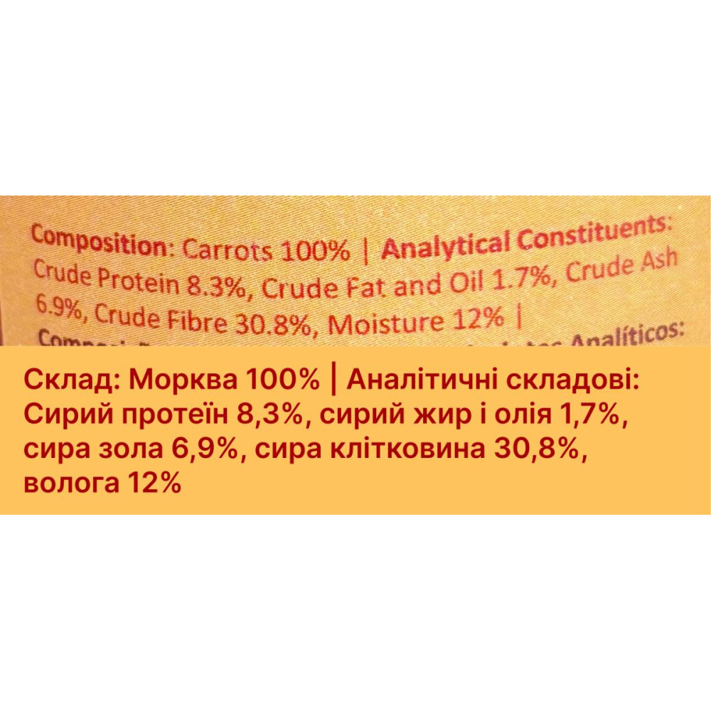 Морква — натуральне джерело бета-каротину та клітковини. Підтримує здоровий зір та обмін речовин. Рекомендована для собак із чутливим шлунком. Хрустка текстура — можна давати як перекус або додавати до корму.