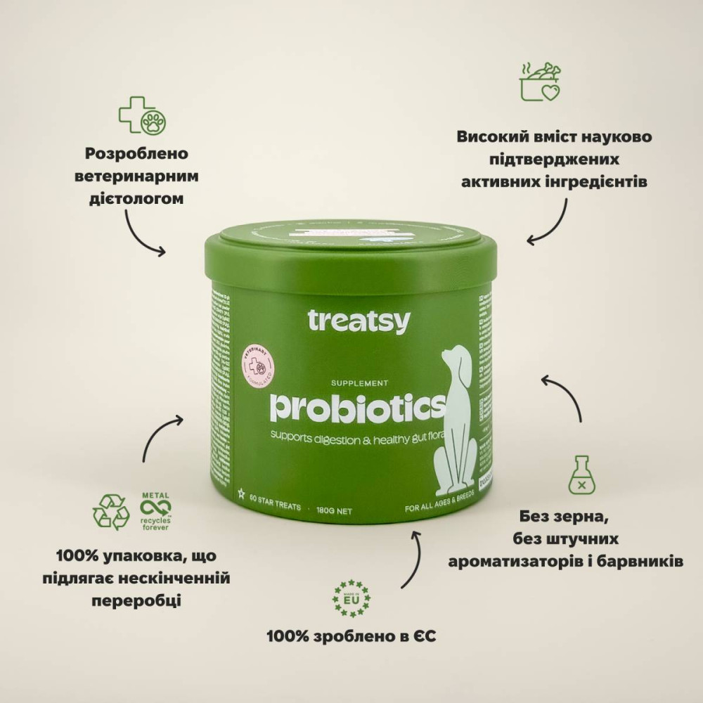 Treatsy Probiotics — функціональна добавка з пробіотиками для нормалізації мікрофлори кишківника, зміцнення імунітету та покращення засвоєння поживних речовин. Містить 3 штами пробіотичних бактерій, пребіотики (корінь цикорію) та псиліум для підтримки здорового травлення. Курятина (22%) забезпечує привабливий смак. 60 ласощів у упаковці 180 г. Без штучних консервантів. Виробництво — Європа.