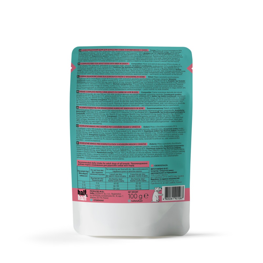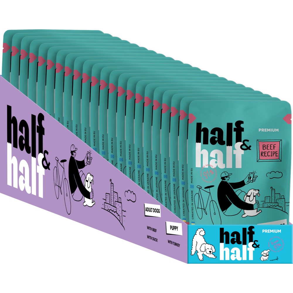 Half&Half Beef in Gravy — вологий корм у паучі зі шматочками яловичини в соусі. М'ясний вміст — 91% (курка 70%, яловичина 10%). Беззерновий рецепт без ГМО. Соус робить корм привабливим навіть для вибагливих собак. Виробляється в Україні.