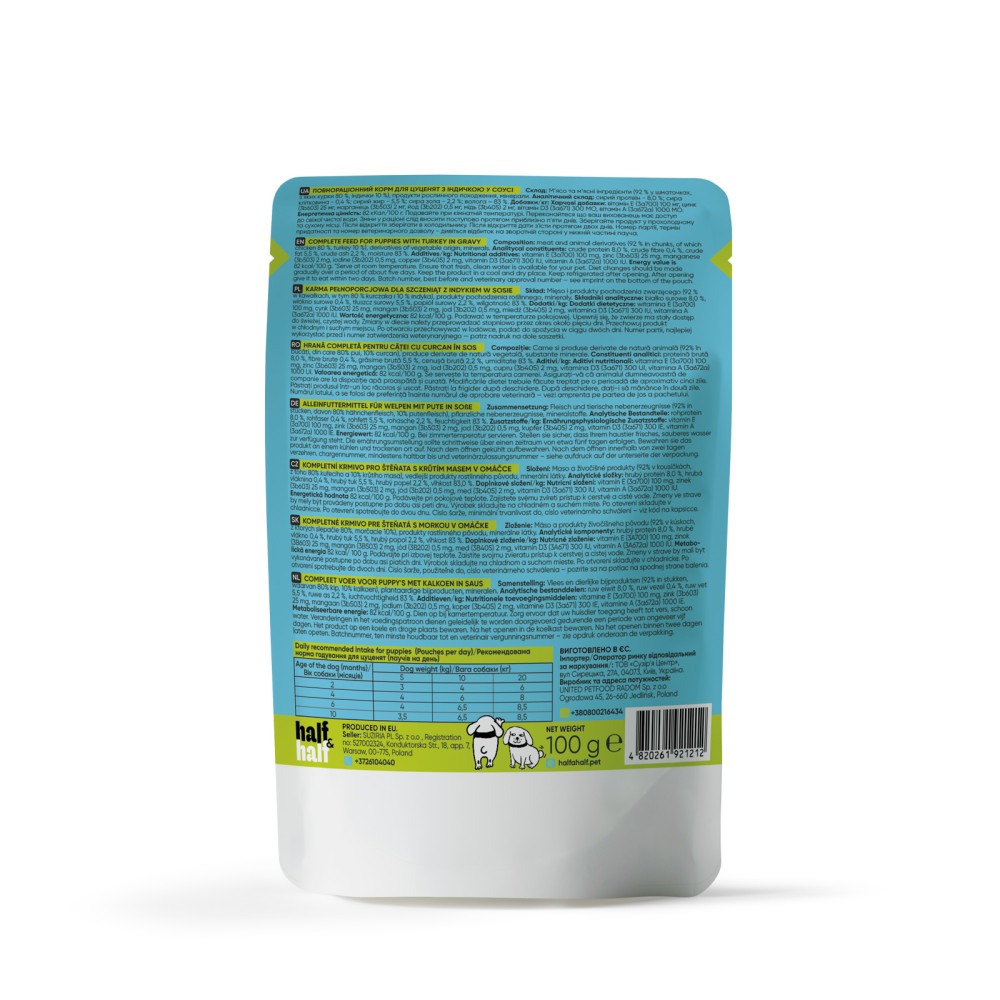 Half&Half Turkey in Gravy for Puppy — вологий корм зі шматочками індички в соусі, розроблений спеціально для цуценят. Підвищений м'ясний вміст — 92% (курка 80%, індичка 10%) та білок 8% забезпечують потреби зростаючого організму. Беззерновий, без ГМО.