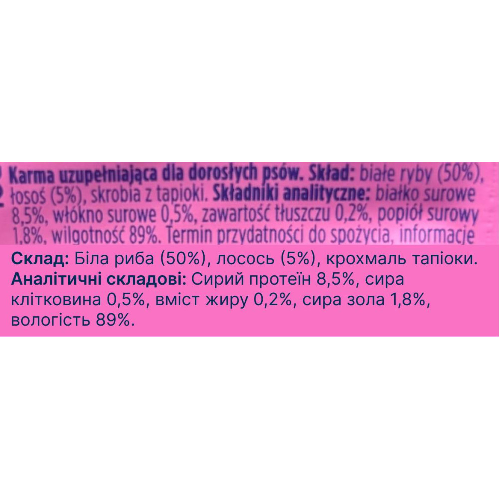 | Склад | Біла риба (50%), лосось (5%), тапіоковий крохмаль |