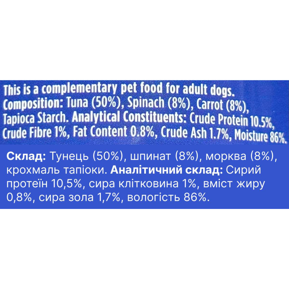 | Склад | Тунець (50%), шпинат (8%), морква (8%), тапіоковий крохмаль |