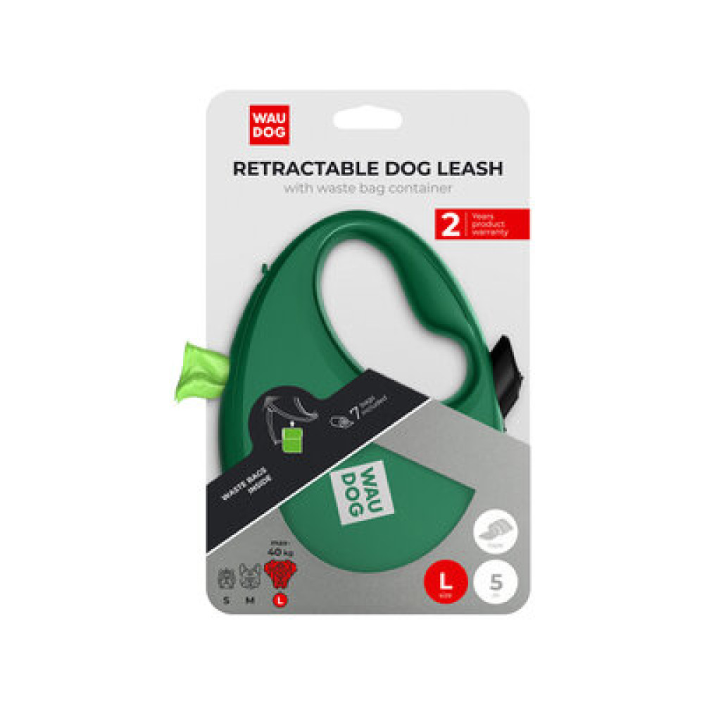 WAUDOG R-leash — легка та міцна рулетка для щоденних прогулянок. Керуйте довжиною одним натиском, тримайте пакети у вбудованому контейнері, залишайтесь помітними завдяки світловідбивній стрічці.