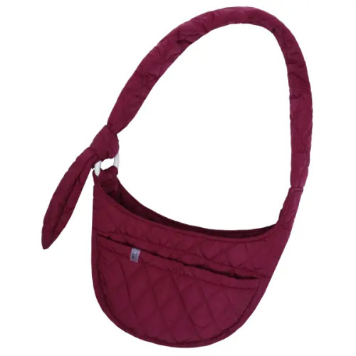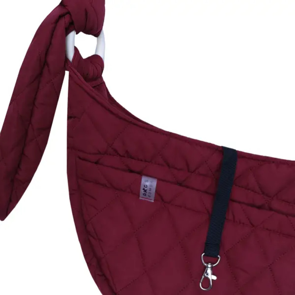 S-118 — стёганый слинг-переноска для собак в цвете «марсала». Снаружи — водоотталкивающая плащёвка, внутри — страхующий ремешок для крепления к ошейнику или шлейке. Регулируемая по длине лямка удобна для ношения через плечо, а карман на кнопке держит мелочи под рукой.