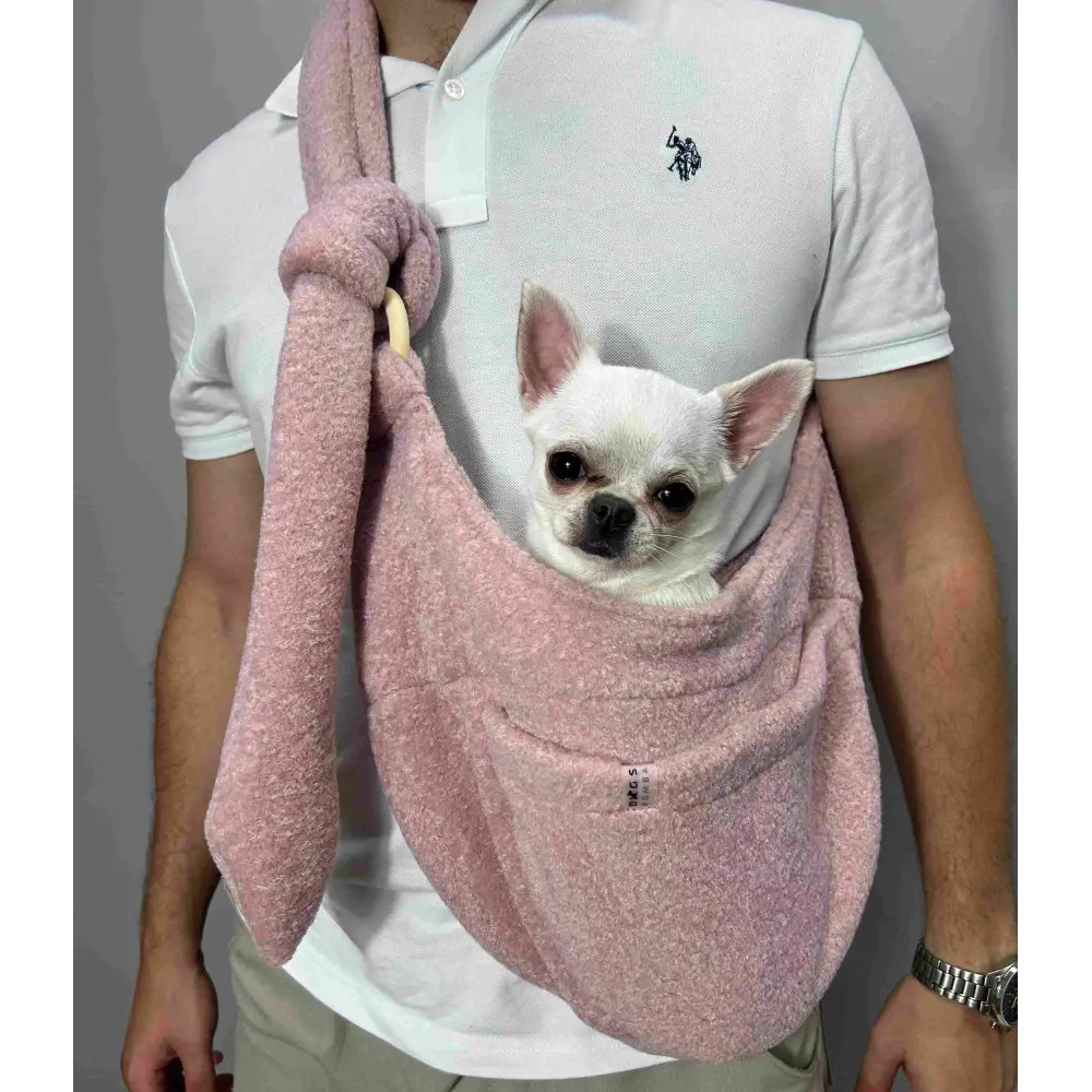 Teddy S-92 — уютный слинг-переноска для собак в цвете «пудра» с тедди-фактурой. Тёплая шерсть-букле комфортна в прохладный сезон, внутри расположен страхующий ремешок для крепления к ошейнику или шлейке. Регулируемая по длине лямка удобна для ношения через плечо, а карман на кнопке держит мелочи под рукой.