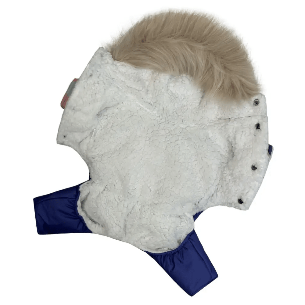 Воротник-стойка и капюшон с кнопкой-фиксатором защищают от ветра и холода, обеспечивая удобство во время прогулок. На шее предусмотрено отверстие для поводка, что делает комбинезон практичным и удобным для повседневного использования.