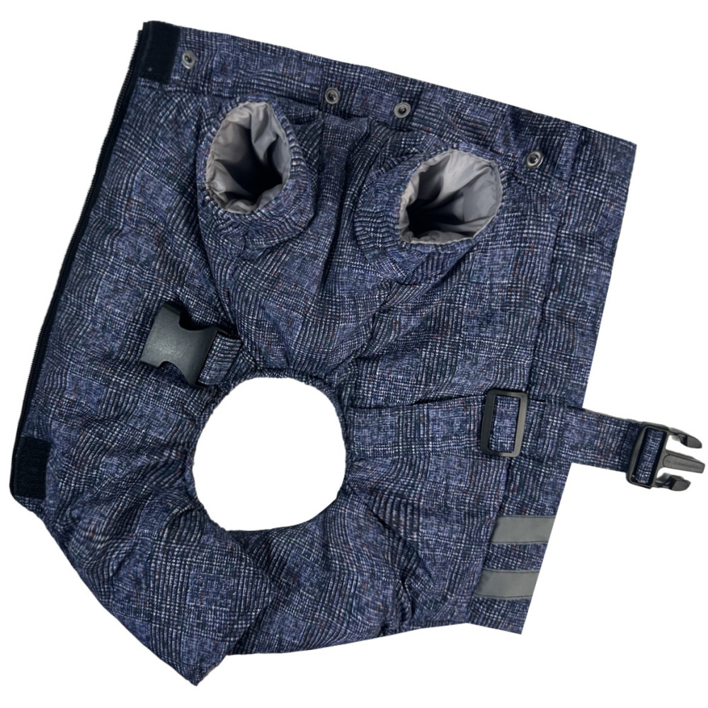 Главной особенностью изделия является наличие пояса, с помощью которого легко регулируется обхват груди. Благодаря этому комбинезон для собак плотно прилегает к телу, не сковывая движений, и эффективно предотвращает задувание холодного ветра внутрь.