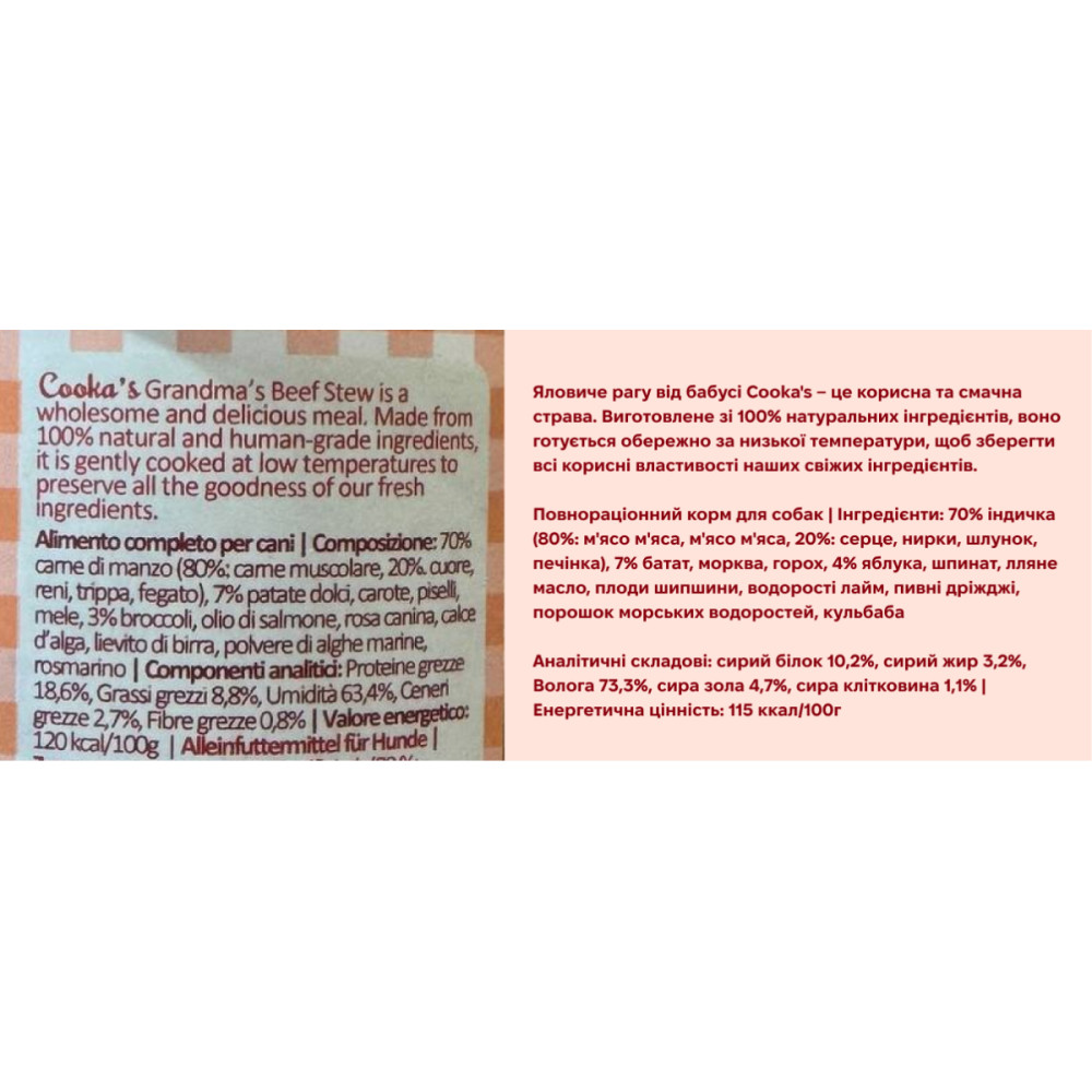 Cooka's Cookies Grandma's Beef Stew — натуральный влажный корм из Португалии, нежно сваренный и натурально законсервированный в стеклянной банке. Изготовлен из более чем 70% свежеприготовленной говядины с бататом, морковью, горохом, яблоками и брокколи. Без зерна, без искусственных добавок и консервантов. Выглядит, пахнет и имеет вкус настоящей домашней еды — готов к подаче.