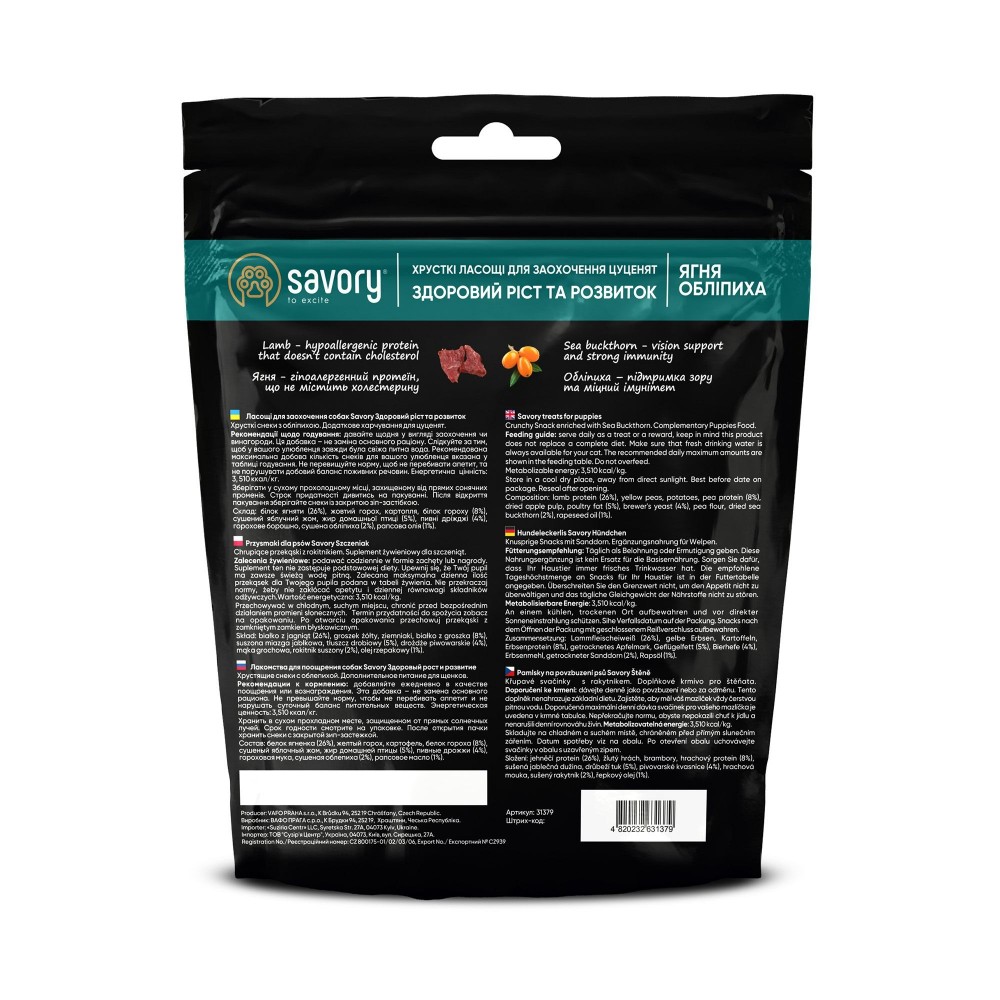 Savory (Україна) виробляє ласощі з натуральних інгредієнтів. Ексклюзивна рецептура з м’ясом першої категорії без сої та ГМО. Без зерна, цукру, штучних консервантів та барвників — тільки корисне для вашої собаки.