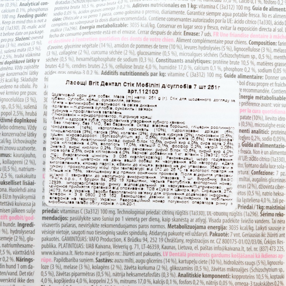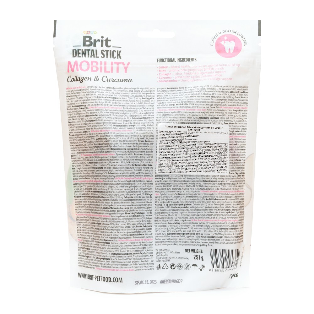 Снеки з колагеном і куркомою для щоденного догляду за зубами собак. Піклуються про здоров'я суглобів, хрящів, сухожиль і зв'язок улюбленців. Brit Dental Stick спеціально створені для догляду за зубами песиків, ці функціональні ласощі ідеально підходять для щоденного споживання. Їхня структура розроблена для механічного очищення зубів, а гексаметафосфат натрію (SHMP) виконує функцію зубної пасти. • М'ята – антимікробні властивості та свіже дихання • Колаген – підтримка суглобів, сухожиль і зв'язок • Куркума – профілактика запалень • Глюкозамін – хондропротектор, підтримує хрящі • SHMP – здоров'я зубів, профілактика утворення зубного каменю • Без глютену, без ГМО, без барвників