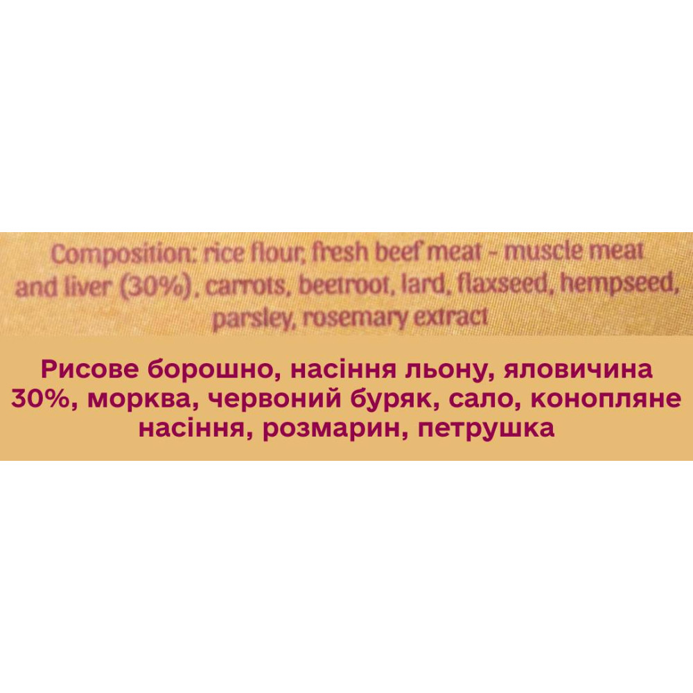 | Состав | Говядина (более 30%), морковь, свёкла, семена льна, конопляное семя, розмарин |
