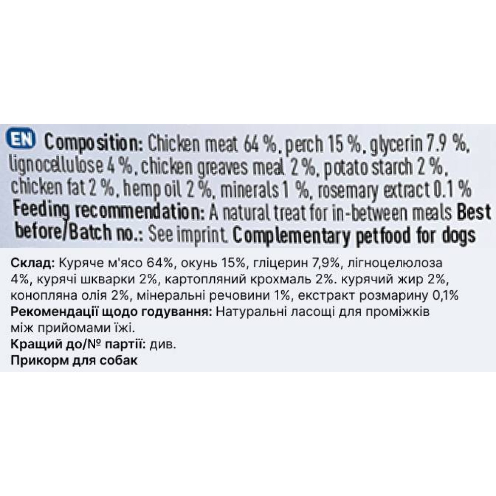 Ингредиенты: куриное мясо (64%), речной окунь (15%), глицерин (7,9%), лигноцеллюлоза (4%), куриный мясной шрот (2%), картофельный крахмал (2%), куриный жир (2%), конопляное масло (2%), минералы (1%), экстракт розмарина (0,1%).