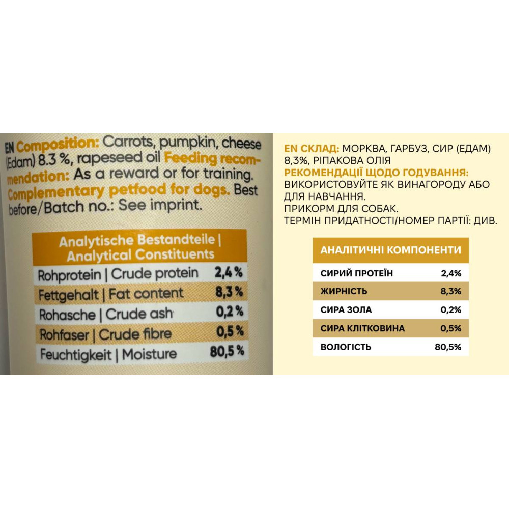 Выдавливайте небольшое количество на лизальные коврики, в миску или давайте непосредственно из тюбика. Идеально для тренировок — собаки обожают сырный вкус. Не заменяет основной корм.