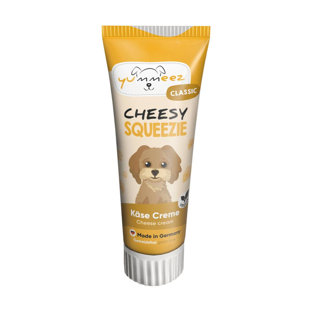 Yummeez Cheesy Squeezie — жидкие лакомства с натуральным сыром Эдам (8,3%) в удобном тюбике. Морковь и тыква обеспечивают натуральный вкус и витамины. Жидкая консистенция идеальна для лизальные коврики, тренировок, как топпинг к сухому корму или для маскировки лекарств. Низкокалорийные (107 ккал/100 г). Без зерна, без сахара. Производство — Германия.