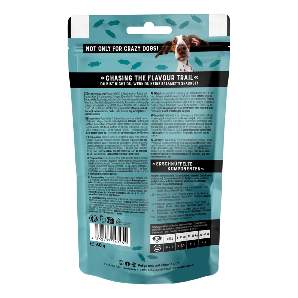Chewies Salametti Буйвол и Сыр — натуральные сушёные колбаски в формате мини-салями. Основу составляет мясо водяного буйвола (92%) — это монопротеиновый продукт с одним источником животного белка, что важно для собак с пищевой чувствительностью. Безлактозный сыр (2%) добавляет вкусовую привлекательность без риска расстройства пищеварения.