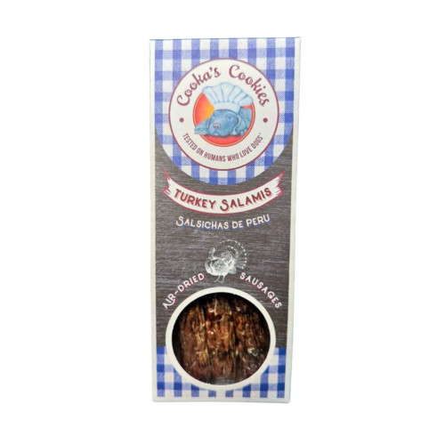 Cooka's Cookies Turkey Salamis — натуральные сушёные колбаски из Португалии из 100% натурального мяса индейки. Выглядят как настоящие салями — вкусные колбаски с жевательной текстурой, которую собаки обожают.