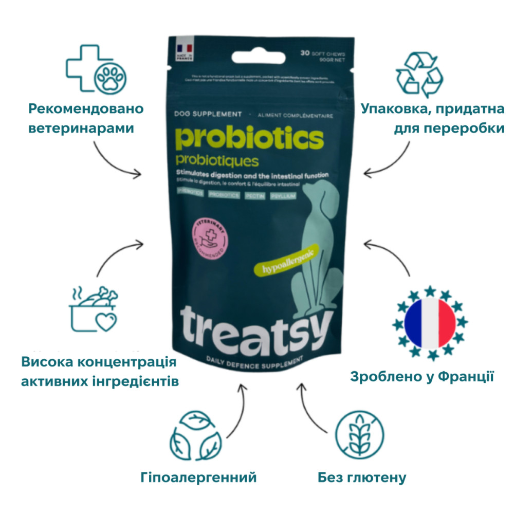 Treatsy Daily Defence Probiotics — ежедневная добавка для поддержки здорового пищеварения и микрофлоры кишечника. Содержит пробиотик Enterococcus faecium, пребиотики FOS и псиллиум для комплексной поддержки ЖКТ. Компактный формат 30 лакомств для ежедневного использования. Особенно полезно во время и после приёма антибиотиков, при смене корма или стрессе. Производство — Европа.